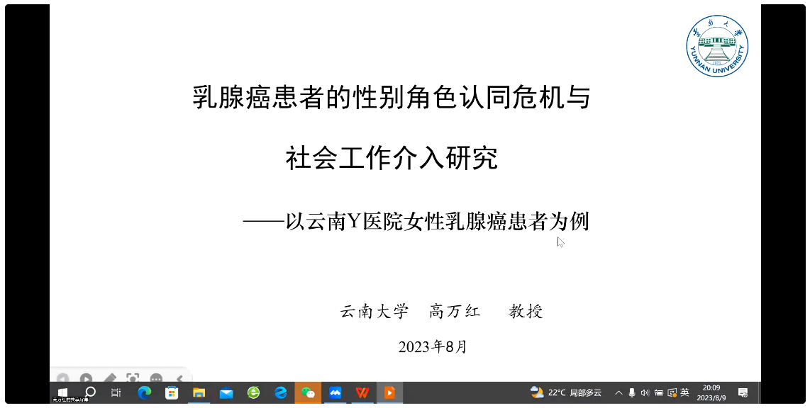 与此同时,高教授分享了她和她的研究生发表的一篇论文,题目为“乳腺癌患者的性别角色认同危机和社会工作介入研究”,高教授不仅提出了社会工作人才培养的不足,还提到了研究者在研究过程中的反身性思考,在研究时需要结合实践者,研究者和服务对象的反思,在反思当中去深刻理解社会问题的本质,同时看到自身的限制。