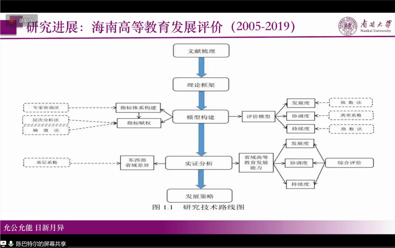 接着,陈巴特尔教授介绍了他们在其他地区研究基础上建立的一套海南高等教育评价体系(见下图)。从发展度、协调度、秩序度等指标评价海南高等教育,提出了通过借鉴新加坡的高层次人才培养与管理的方式来建设海南自贸港高质量教育体系。