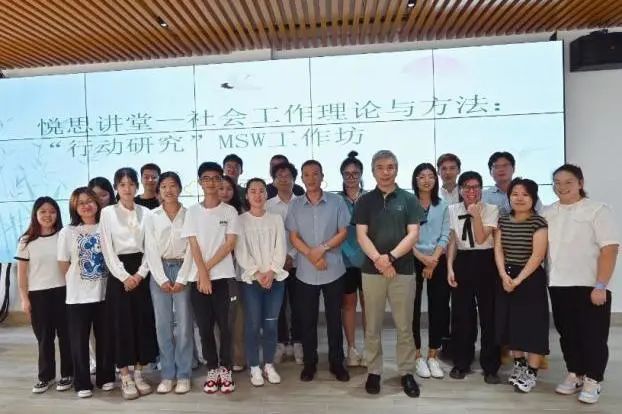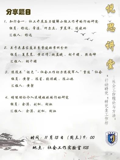 紧接着,四组研究生代表上台展示ppt案例,每组案例报告完毕后师生共同交流探讨,进一步加深同学们对社会工作行动研究的了解。