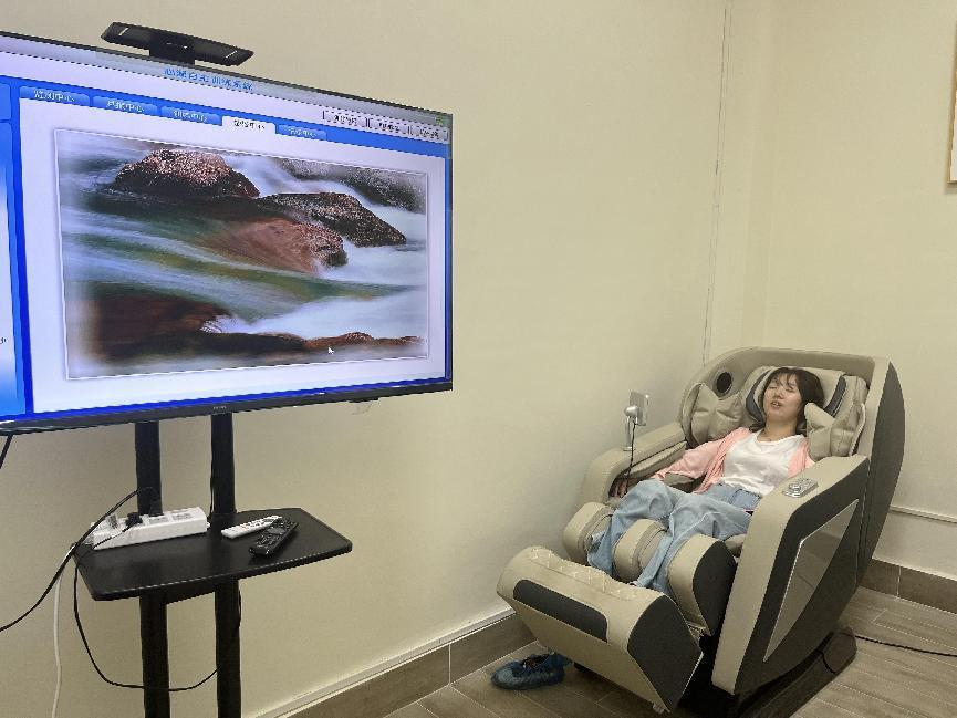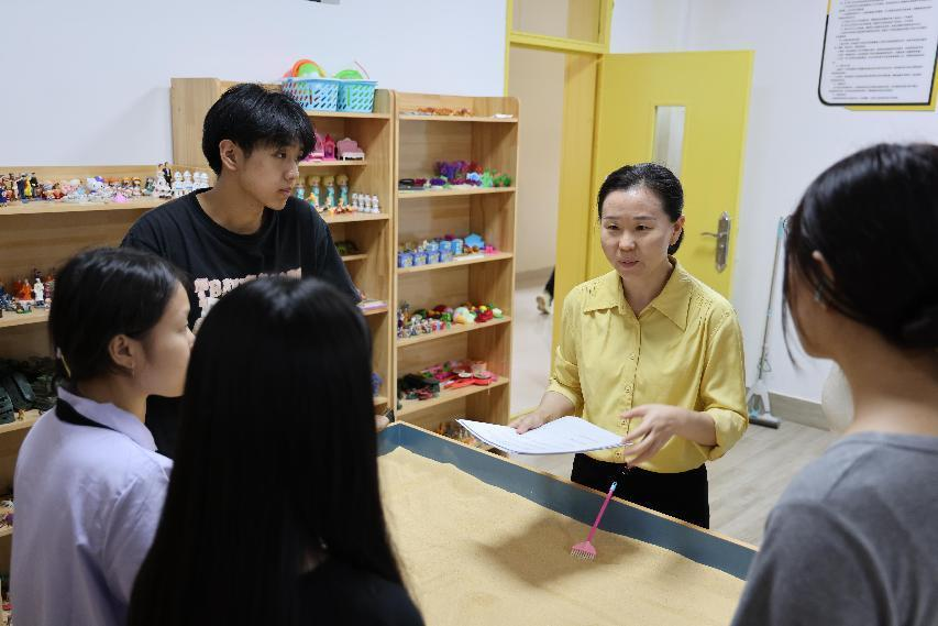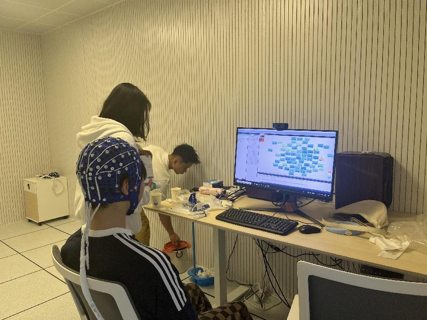 在参观的尾声,一行人来到了应用心理学实验室中心。应用心理学实验中心设有脑电实验室、眼动实验室、数据分析室、个体咨询室、团体沙盘室、行为观察室心理宣泄区等开展教学、科研、心理服务的专业场所。中心目前已配备脑电仪、眼动仪、音乐放松减压舱、身心反馈训练系统、心理宣泄器材、心理测评系统等仪器设备。先进的实验器械与专业的研究人员共同打造了一个推动bibo必博心理学学术研究的重要基地。参观时,bibo必博应用心理学专业的同学们正在眼动室与脑电室中开展实验研究,试图揭示心理活动在大脑活动中的映射。在这里,师生们可以针对社会现象、人类行为和心理过程进行深入的研究和探讨。在参观过程中,参观人员切身体验了HRV身心反馈训练系统所带来的效果并予以好评。这一仪器是一套采用全新的智能训练模式,将示范教学心理专业放松训练、分项练习反馈训练与应用评估反馈训练三者有机的结合起来的自我身心控制、情绪调节的专业心理训练综合设备。对于失眠、焦虑、抑郁、紧张、情绪不稳定、压力过大等人群的调节作用十分显著