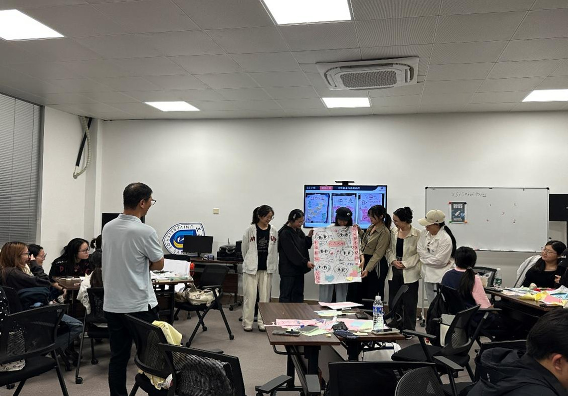 在随后的破冰分组环节,课堂气氛热烈活跃。来自不同专业的同学在老师的引导下混合编组,展开头脑风暴。创意在笔尖流淌,思维在跨学科交流中碰撞,短短十余分钟,多支特色鲜明的团队相继成型:“社媒创客团”以“多学科融合,创直播新篇”为口号,将《倔强》改编为团队战歌;“吉播新力量”则喊出“青春敢闯,直播有方”的响亮口号,以《夜空中最亮的星》诠释创业初心。各组展示环节,手绘海报创意十足,激昂口号此起彼伏,跨专业协作的团队凝聚力在欢声笑语中悄然形成。